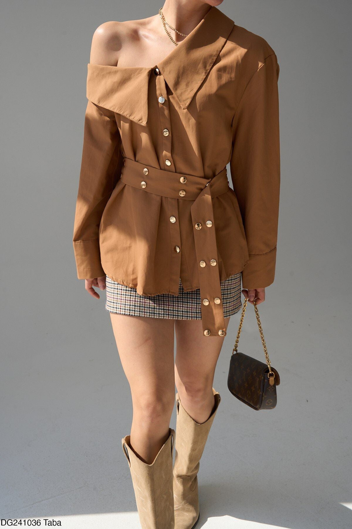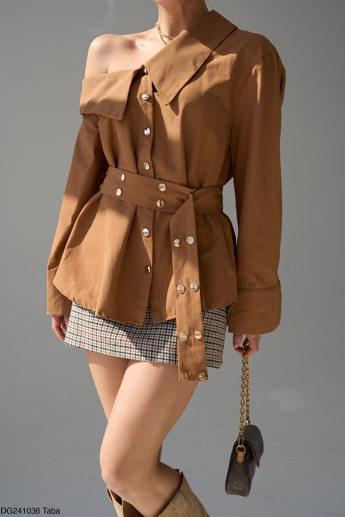 Bu şık gömleğin yaka kısmında kayık yaka bulunmakta ve düğmelerle detaylandırılmış kemerin rahat ve şık bir görünüm sunuyor. Gardırobunuz için mükemmel bir seçenek olabilir.