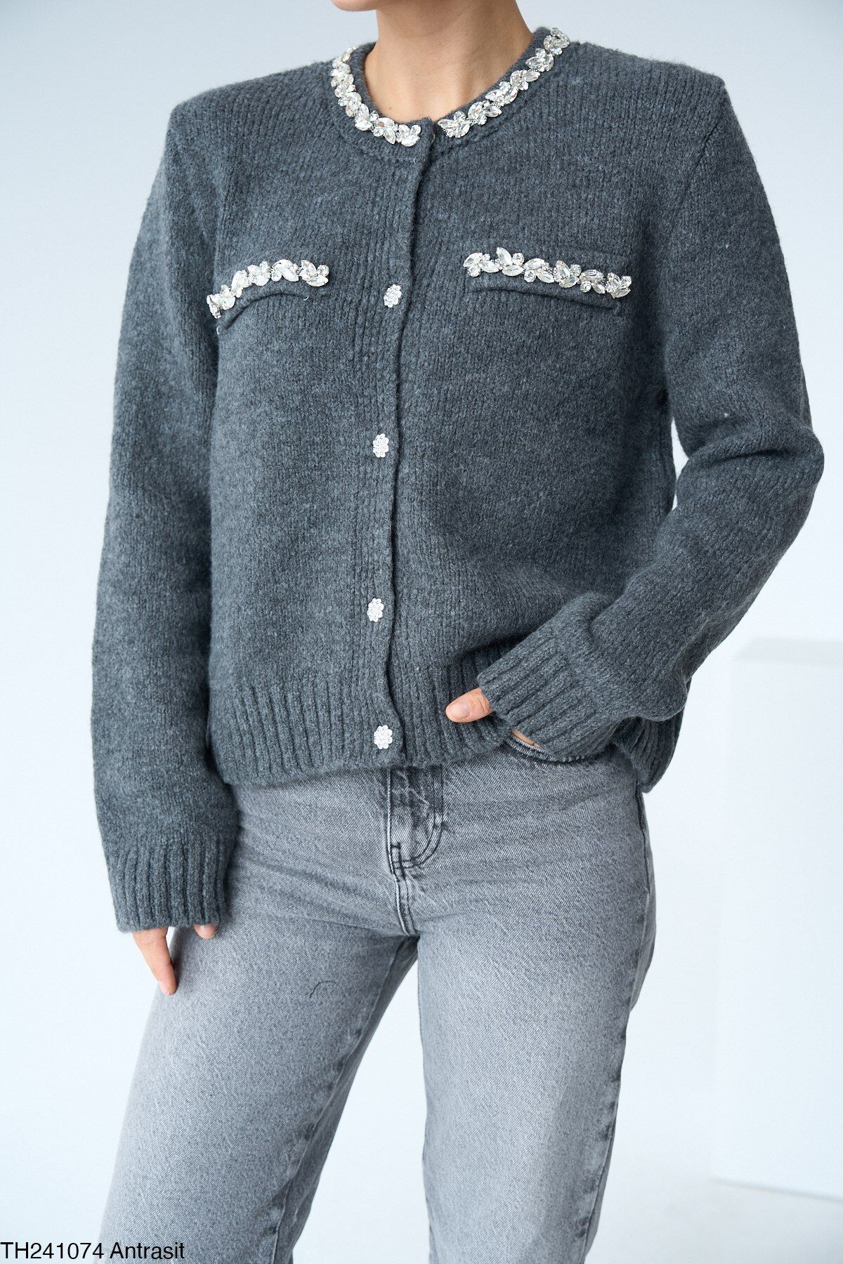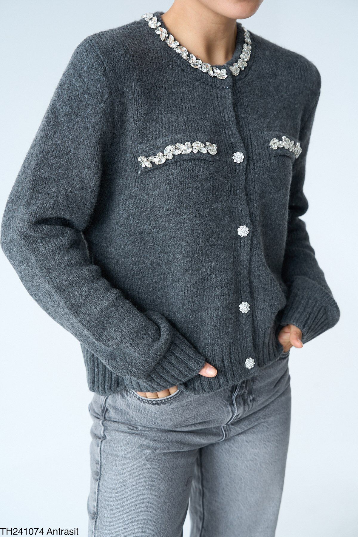 Yünün sıcaklığı ve taş detaylarıyla modern şıklığı bir araya getiren bu hırka, tam kalıp kesimi ve özel tasarım düğmeleriyle dikkat çekiyor. Cep detaylarındaki taşlar ise hırkaya zarif bir dokunuş katıyor, kombinlerinizi tamamlamak için mükemmel bir seçenek!